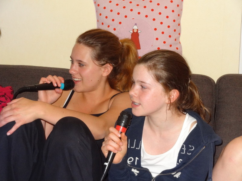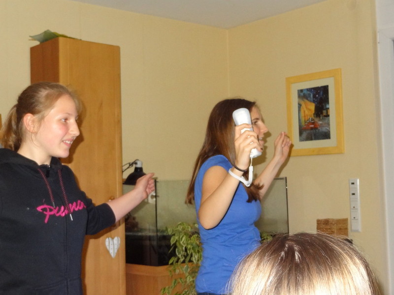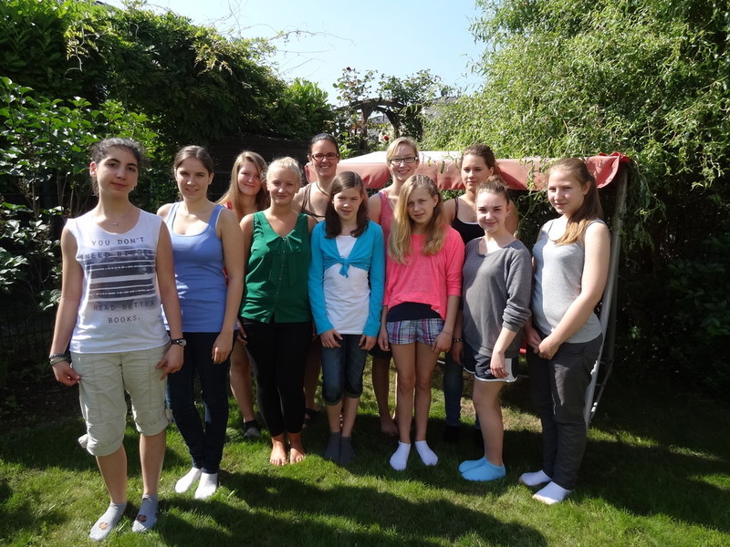 Als alle sich mit vollem Bauch eigentlich kaum noch bewegen konnten, war es jedoch Zeit genau das zu tun: mit großer Motivation ging das traditionelle Völkerballspiel auf der Straße los. Zunächst musste aber erst einmal ein Völkerballfeld auf die Straße gemalt werden, was schon zu einer großen Herausforderung wurde. Wir wollten ja keines der in Nähe stehenden Autos „in Gefahr bringen“. Von der Dunkelheit unterbrochen hieß es erst einmal, das Bettenlager unterm Dach herzurichten und dann schließlich „ran an’s Mikro“ und los ging das Geträller. Ob Schlager oder Pop, bei Singstar kam jeder auf seine Kosten. Zum Abschluss wurden noch ein paar Runden bei „Just Dance“ die Hüften geschwungen und dann waren die Älteren langsam aber sicher schlafbereit. Mit großem Gejammer, von den aufgedrehten Jüngeren, ging es in die Schlafsäcke und es kehrte allmählich Stille ein. Vorbei war der alljährliche Abschlussgrillabend bei Trainerin Andrea Schmidt, der aber noch am nächsten Morgen mit einem gemütlichen Frühstück auf der Terrasse beendet wurde.